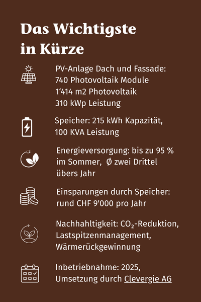 Dank des Gewerbespeichers sparen wir jährlich rund CHF 9'000 an Energiekosten und senken gleichzeitig unseren CO₂-Fussabdruck. Damit leisten wir einen aktiven Beitrag zur Energiewende und zeigen, dass Wirtschaftlichkeit und Nachhaltigkeit Hand in Hand gehen können.