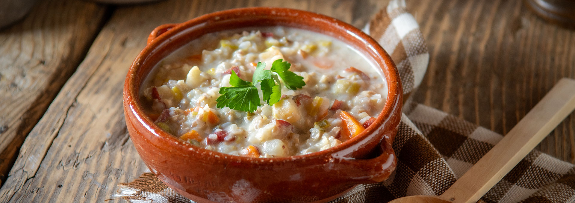 1. In einer Pfanne Zwiebeln in Butter kurz andämpfen. Rüebli, Knollensellerie und Lauch beigeben und ca. 5 Minuten mitdämpfen. Bündnerfleisch, Thymian und Lorbeerblatt kurz mitdünsten und mit Bouillon ablöschen. Kurz aufkochen, danach Hitze reduzieren und für 10 Minuten köcheln lassen.