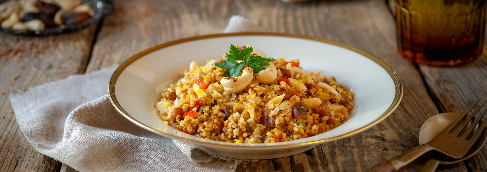 5. Anschliessend alles mit den Mandeln und dem Bulgur mischen und warm servieren.