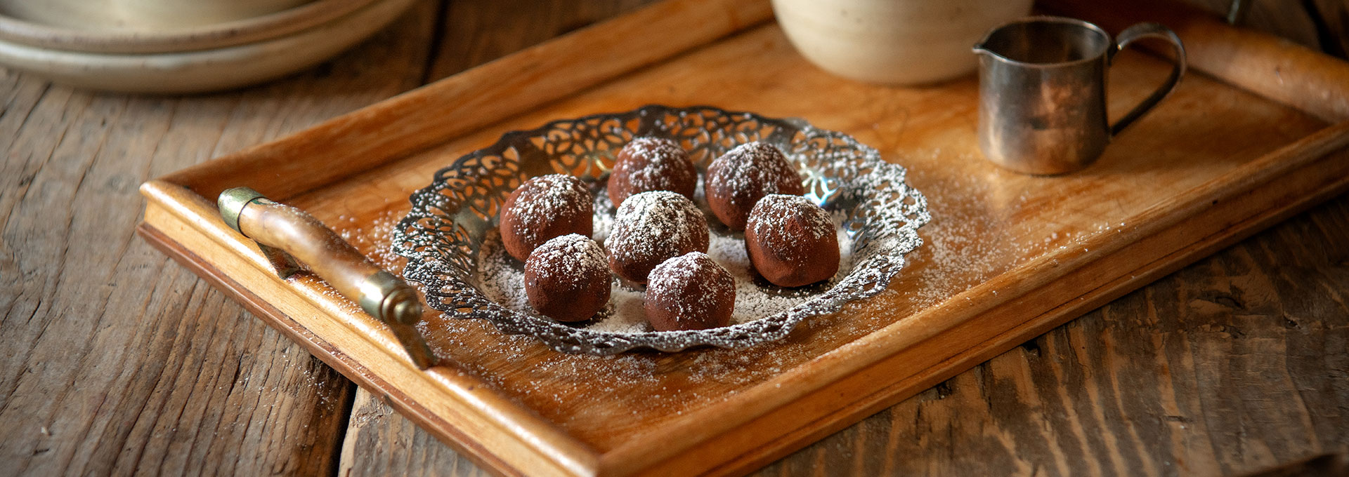 4. Die Masse zu kleinen Praliné-Kugeln formen und im Kakaopulver wenden.