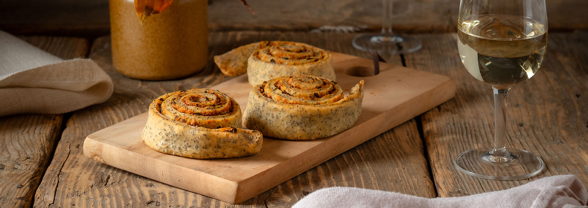 3. Den aufgegangenen Teig mit wenig Mehl zu einem Rechteck von ca. 40 x 50 cm auswallen. Die Füllung auf dem Teig verteilen. Den Teig aufrollen und mit einem scharfen Messer in ca. 3 cm dicke Stücke schneiden.