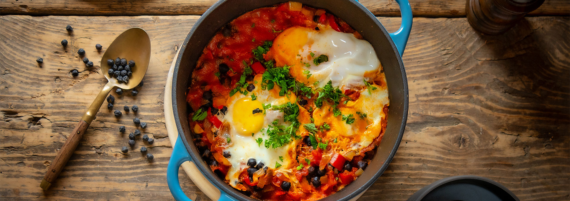 7. Mit einem Löffel 4 Mulden in die Sauce drücken. Die rohen Eier vorsichtig in die Mulde gleiten lassen.