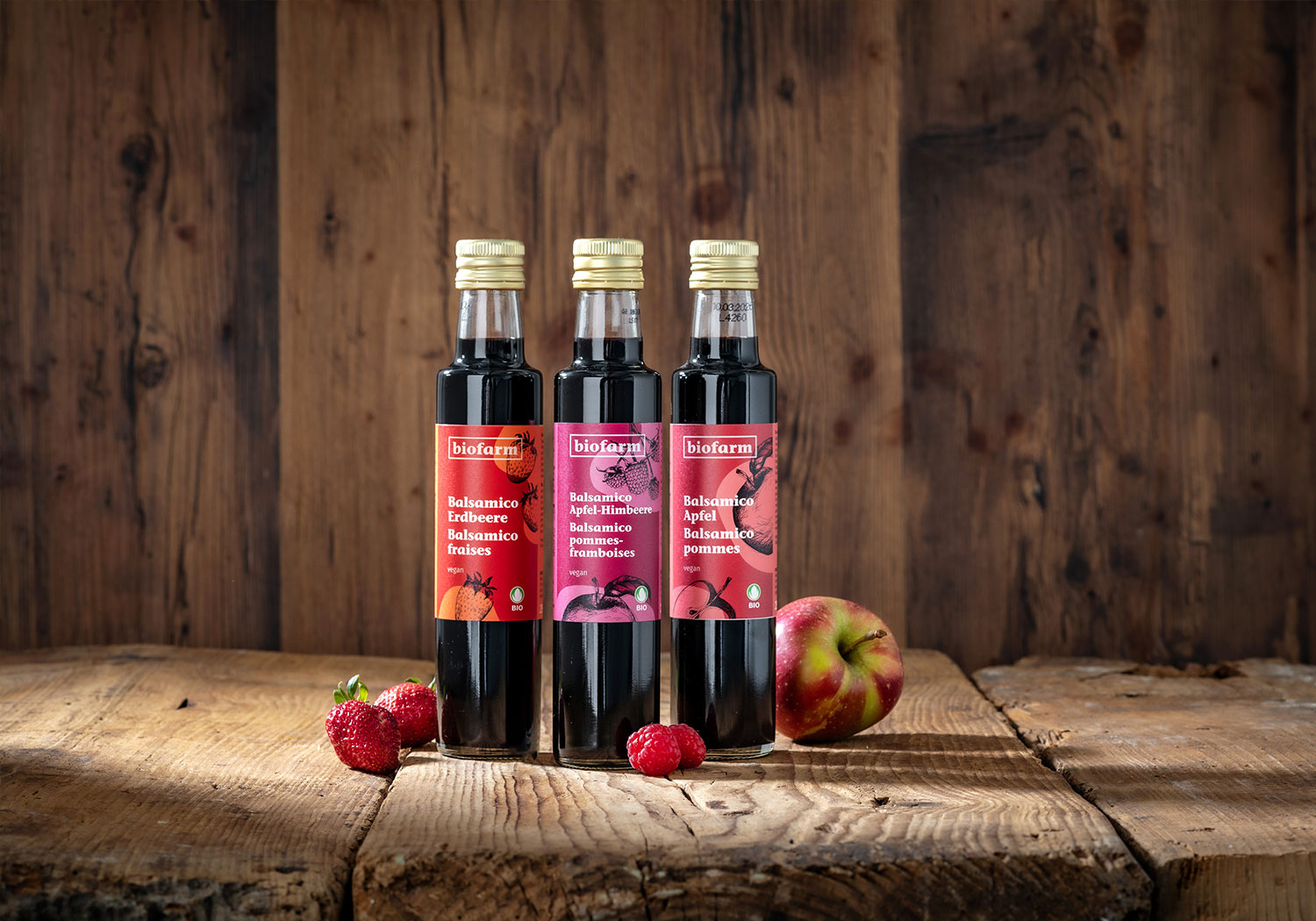 Nos vinaigres balsamiques raffinés sont disponibles en trois saveurs: pomme, framboise, fraise. Il convient de souligner la forte proportion de concentrés de jus de fruits qui les caractérise. Ils confèrent ainsi aux salades, aux sauces, aux plats de volaille ou de viande une note particulièrement raffinée. Ils sont également de fabuleux compagnons pour les fromages et les desserts.