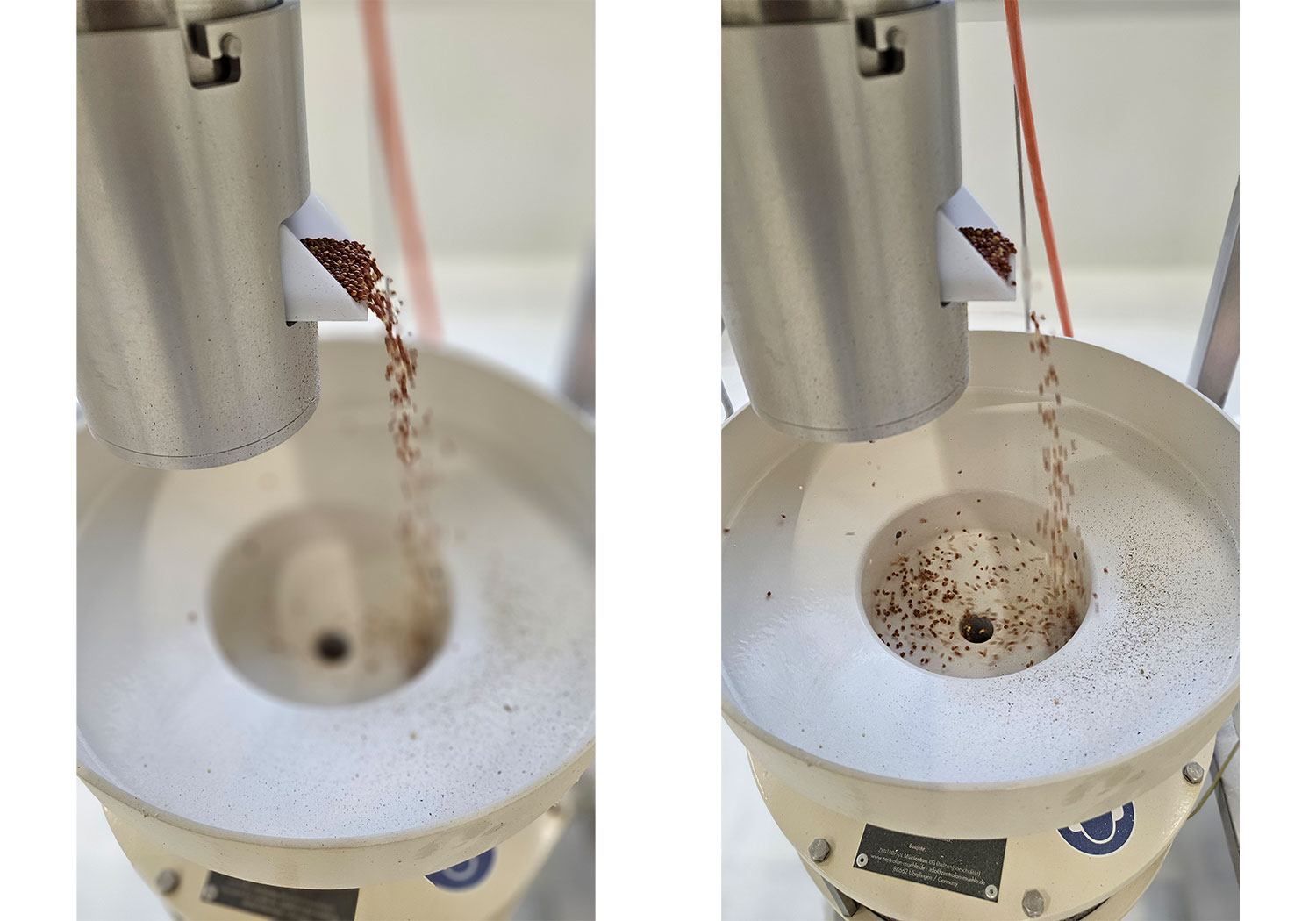 À Huttwil, nous traitons le millet brun cultivé en Suisse avec un soin tout particulier. La transformation de cette céréale est réalisée à l’aide de notre nouveau moulin Zentrofan. Grâce à cette technologie, les précieux grains de millet ne sont ni écrasés ni broyés, mais moulus par un flux d'air constant contre la meule naturelle en lave basaltique. Le réglage du moulin exige beaucoup de doigté et de patience de la part de nos collaborateurs. Trouver le réglage précis qui permet d’obtenir une farine de la qualité souhaitée n’est en effet pas si facile.