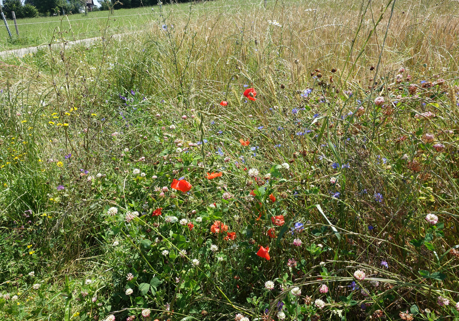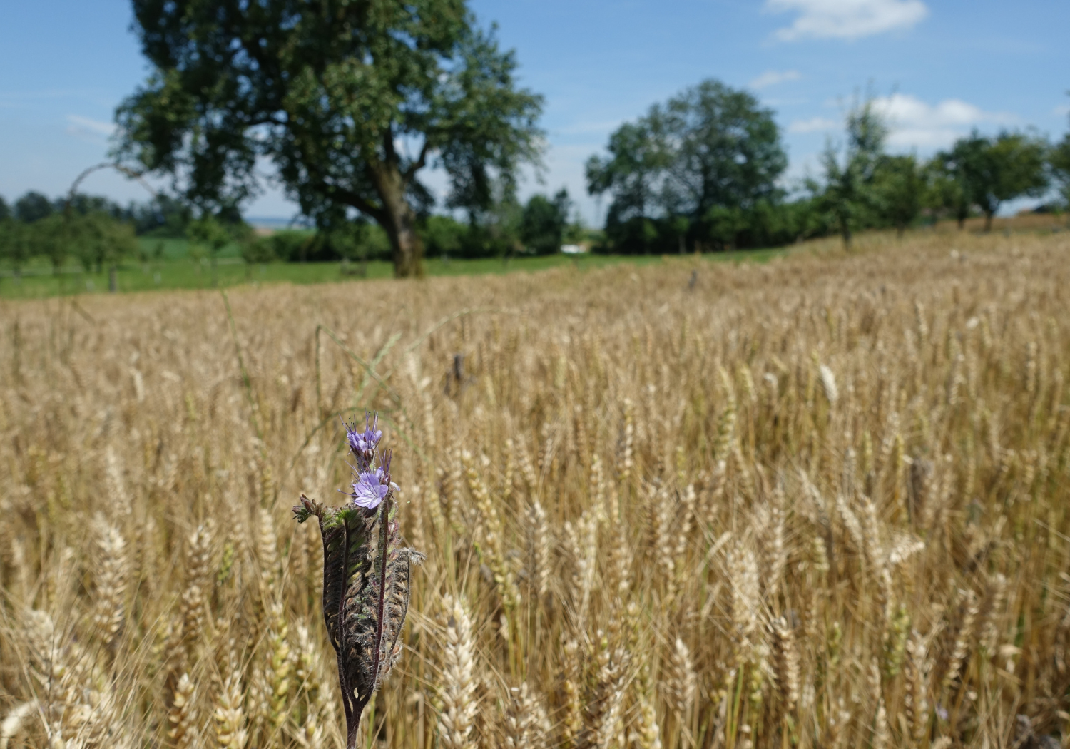 Mit der Winterweizensorte Montalbano macht er gute Erfahrungen. Sie ist kurzwüchsig und standfest. Anfangs Oktober beginnt Adrian Rubi mit der Aussaat. Hier, auf 750 m ü. M., kann es im Herbst schnell mal kalt und/oder nass werden. Mit einer Untersaat, bestehend aus Phacelia und Inkarnatklee, setzt der Biolandwirt gleichzeitig auf Biodiversitätsförderung. Er erklärt: «Ich habe dadurch mehr Insekten im Weizenfeld, auch Bienen und Spinnen etwa, aber über und im Boden mehr Biodiversität und damit weniger Schädlingsdruck.» Und ist sein Weizen braun, so dass er keine Photosynthese mehr bildet, dringt wieder mehr Licht bis zum Ackerboden. «Dieses Licht vermögen andere Pflanzen aufzufangen, die ihrerseits Photosynthese bilden und so den Boden tragfähiger fürs Dreschen im August machen, aber auch nahrungsfähiger für Mikrobiologie (Stoffwechsel und dessen Wirkung zwischen verschiedenen Organismen)», so Adrian Rubi.