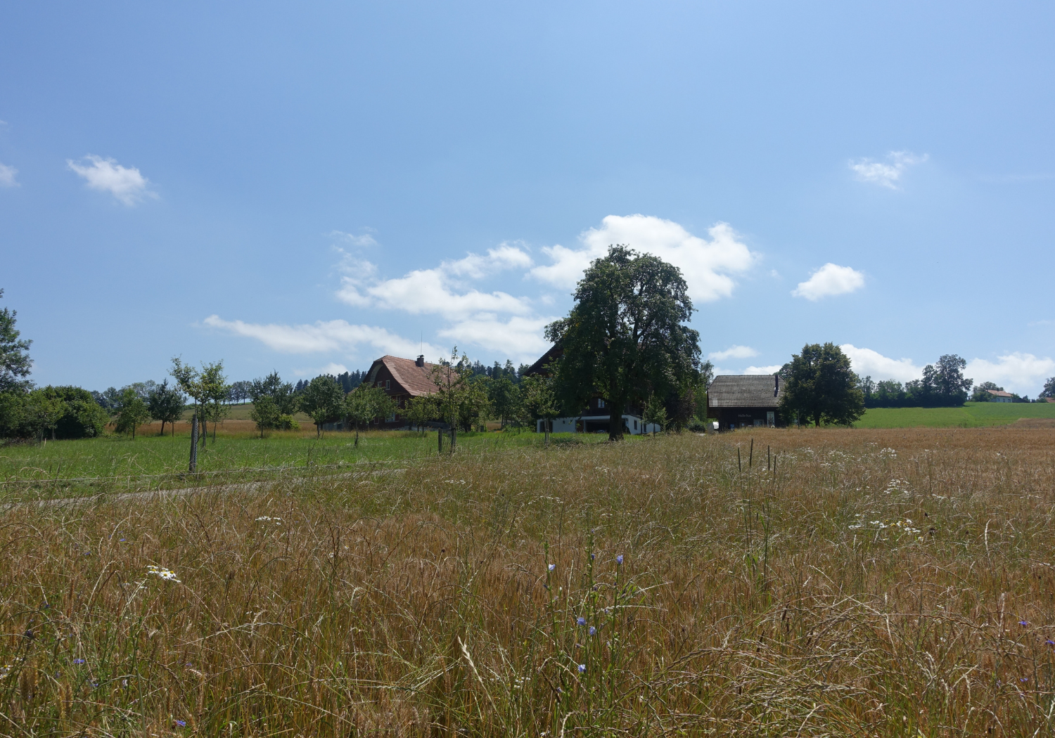 Von weitem ist der Biohof Halterhus erkennbar. Zwischen den steilen Dachschrägen des Wohnhauses blicken die Fenster der dunklen Holzfassade auf Wiesen, Hochstammbäume, Hecken und bunte Blühstreifen. Oberhalb von Ruswil (LU) baut Adrian Rubi für die Biofarm-Genossenschaft unter anderem Weizen an. Und er tut sehr viel für die Natur.